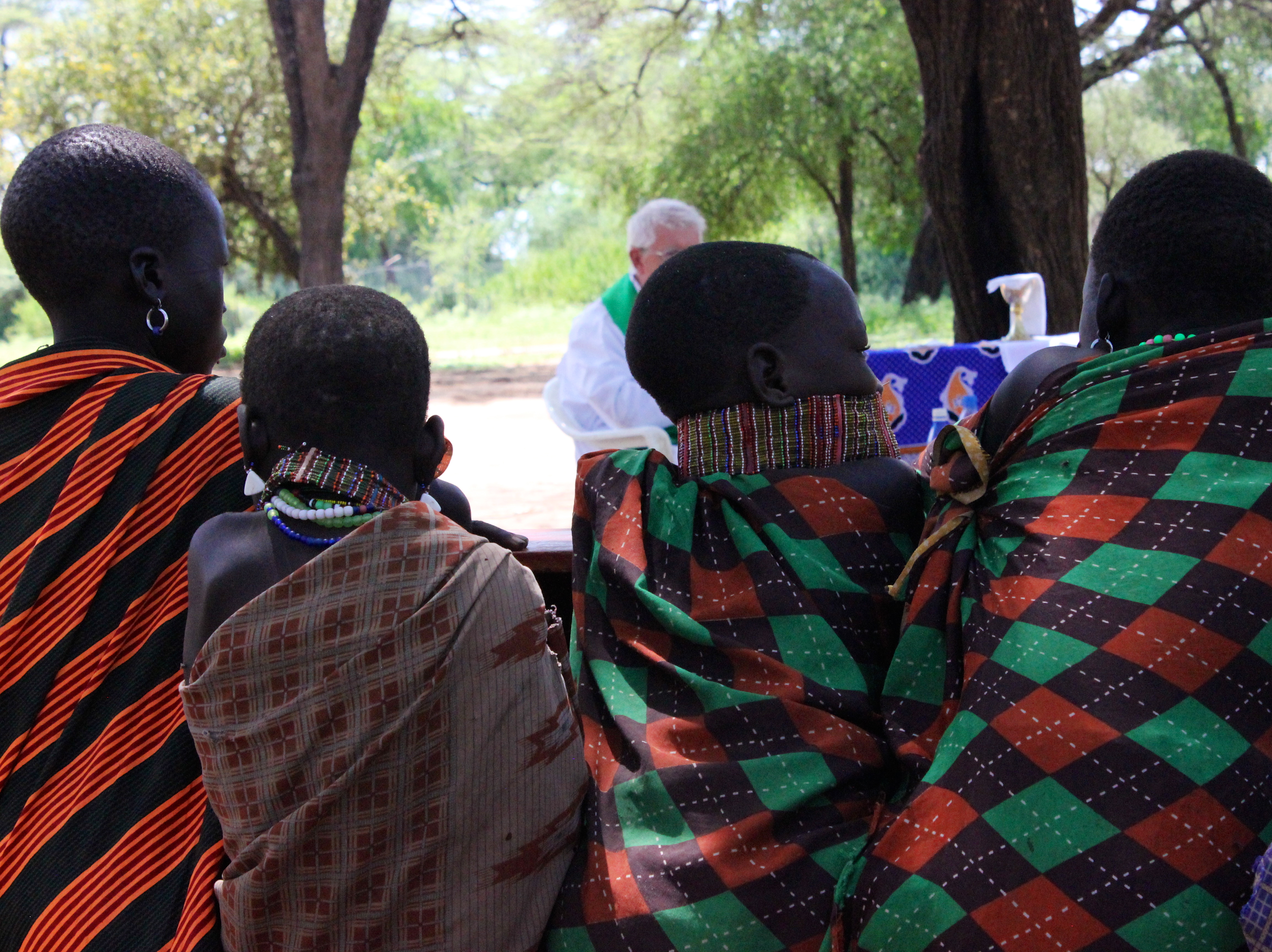 Toposa village girls hearing Mass under a mango tree in Lolim